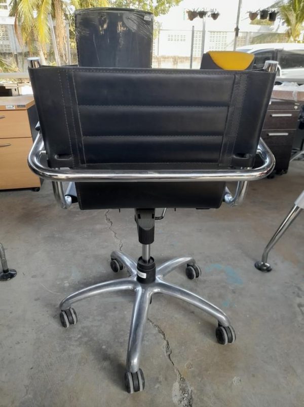 วัสดุ : หนังแท้สีดำ ขาเหล็ก 5 ล้อ ที่วางแขนเหล็กพร้อมฟองน้ำบุหนังหุ้ม